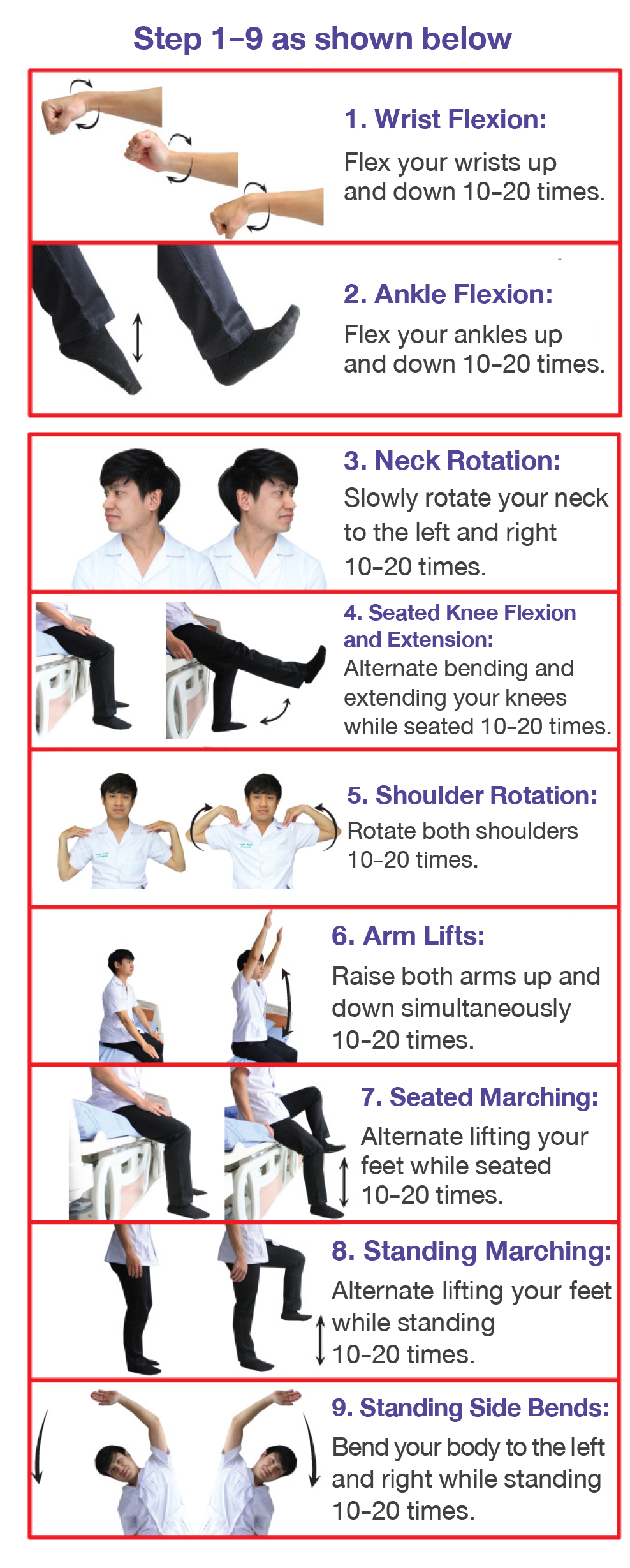 Begin with a warm-up by performing exercises from step 1 to 9, and cool down by reversing the order from step 9 to 1, or follow the cardiac rehabilitation team’s guidance. During exercise, maintain continuous movement, avoid holding your breath, and do not tense up.