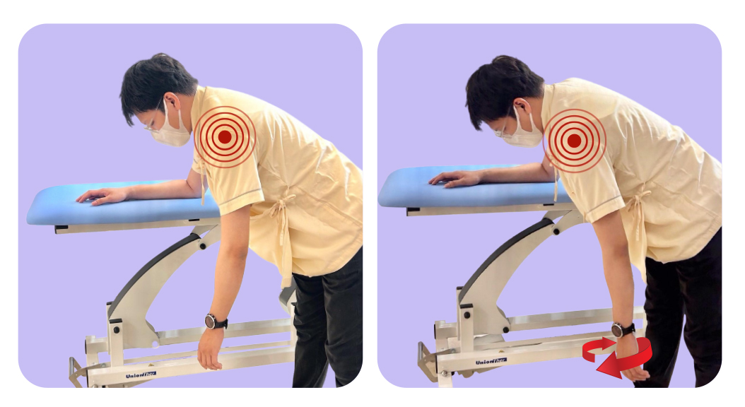 ยืนโน้มตัวมาข้างหน้า ปล่อยแขนสบายๆ จากนั้นค่อยๆเหวี่ยงแขนเป็นวงกลมเล็กๆ วนตามเข็มนาฬิกา 10 ครั้ง จากนั้นพัก 1-2 นาที แล้ววนทวนเข็มนาฬิกาอีก 10 ครั้ง เมื่ออาการปวดดีขึ้น สามารถเพิ่มความกว้างของวงการเหวี่ยงแขน และหากต้องการยืดเนื้อเยื่อรอบหัวไหล่เพิ่มขึ้นสามารถถือตุ้มน้ำหนักเบาๆร่วมด้วย ขณะเหวี่ยงแขนได้