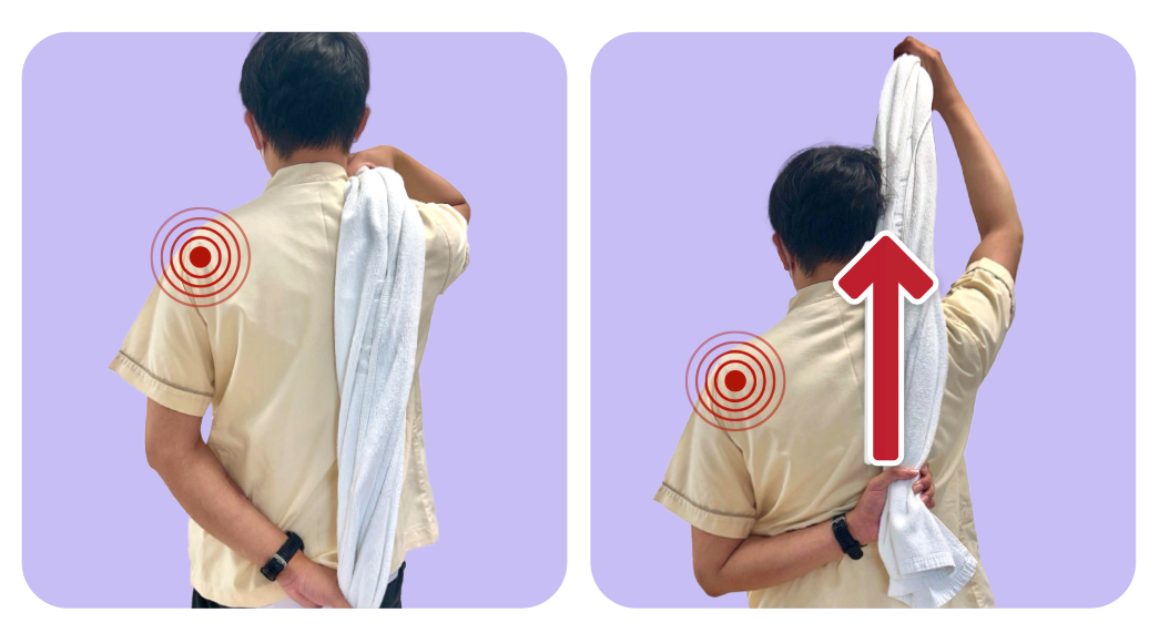 ใช้มือ (ข้างที่ปวดไหล่) ไขว้หลังเพื่อจับปลายผ้าขนหนูด้านล่าง และใช้มืออีกข้างจับปลายผ้าขนหนูด้านบนและออกแรงดึงเพื่อยกแขนข้างที่มีอาการปวด ให้ไขว้หลังได้สูงขึ้น ค้างไว้ 10 วินาที แล้วผ่อนแขนลงมา ทำซ้ำ 10-20 ครั้ง ต่อวัน