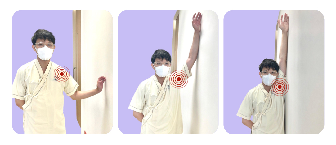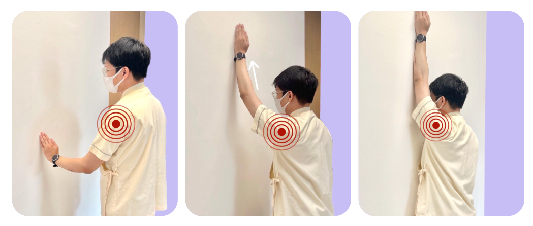 หันไหล่ข้างที่มีอาการเข้ากำแพง ยืนห่างออกมาเล็กน้อย วางสันมือบนกำแพงจากนั้นค่อยๆ ลากมือขึ้นพร้อมกับเดินเข้าหากำแพง ยกแขนค้างไว้เมื่อรู้สึกตึงบริเวณไหล่ ค้างไว้ 10 วินาที แล้วผ่อนแขนลงมา ทำซ้ำ 10-20 ครั้ง ต่อวัน