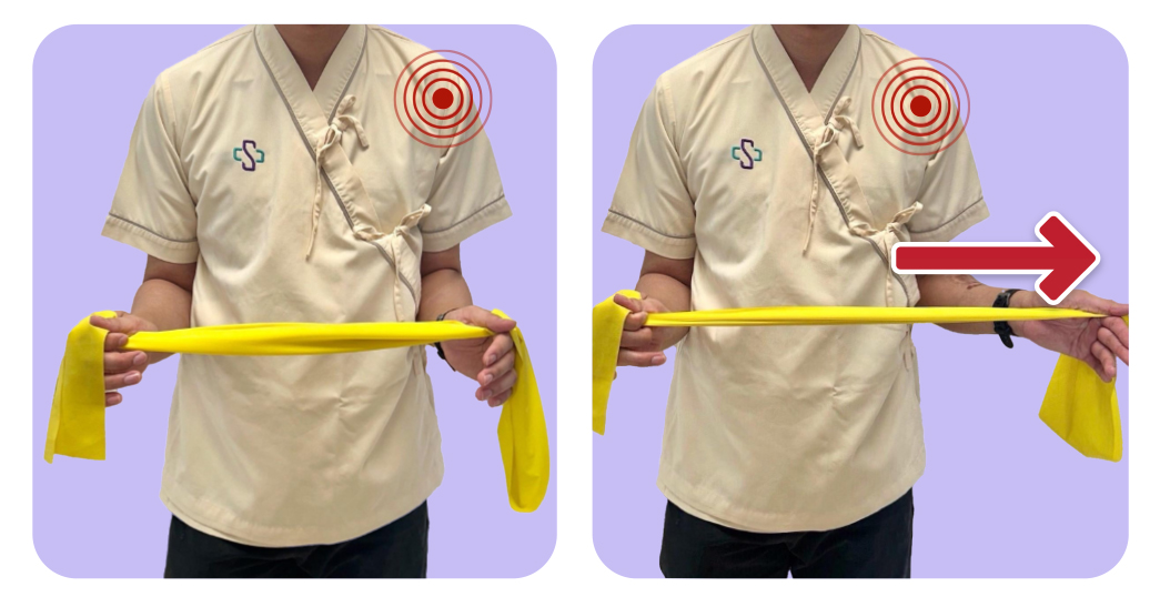งอศอก (ข้างที่ปวดไหล่) ในท่าแขนชิดลำตัว มือทั้งสองข้างจับยาง จากนั้นค่อยๆใช้มือ(ข้างที่ปวดไหล่) ดึงยาง หมุนยืดออกไปทางด้านนอกลำตัว ขณะที่ศอกชิดลำตัวเช่นเดิม ยืดค้างไว้ วินาที ทำซ้ำ 10-15 ครั้ง ต่อวัน