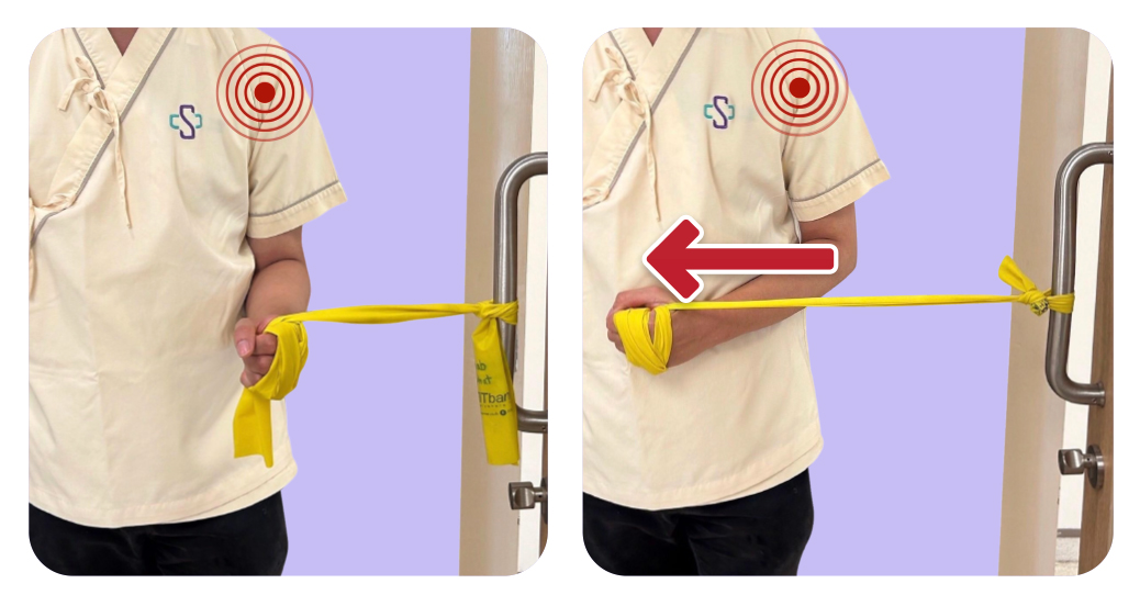 ผูกปลายยางด้านหนึ่งไว้กับที่ยึดเหนี่ยว จากนั้น งอศอก (ข้างที่ปวดไหล่) ในท่าแขนชิดลำตัว ใช้มือจับปลายยางหมุนยืดเข้าหาสะดือ ขณะที่ศอกชิดลำตัวเช่นเดิม ยืดค้างไว้ วินาที ทำซ้ำ 10-15 ครั้ง ต่อวัน