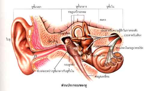 3. หูชั้นใน ประกอบด้วย อวัยวะรับเสียงรูปหอยโข่ง อวัยวะรับการทรงตัวเมื่อหูรับเสียง จะส่งผ่านสัญญาณเสียงผ่านเส้นประสาทการได้ยินและสมองให้รับรู้เสียง