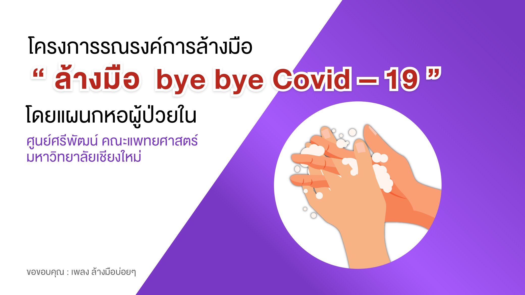 โดยแผนกหอผู้ป่วยใน ศูนย์ศรีพัฒน์ คณะแพทยศาสตร์ มหาวิทยาลัยเชียงใหม่ จัดทำขึ้นเพื่อส่งเสริมให้เจ้าหน้าที่หอผู้ป่วยในและบุคลากรตระหนักและเข้าใจในการล้างมือที่ถูกต้อง มีประสิทธิภาพ ช่วยป้องกันและลดการแพร่กระจายเชื้อ ซึ่งเป็นหนึ่งในแนวทางป้องกันการแพร่กระจายเชื้อไวรัส Covid – 19 ของศูนย์ศรีพัฒน์ฯ ที่ผู้บริหารและบุคลากรทุกคนปฎิบัติตามอย่างเคร่งครัด